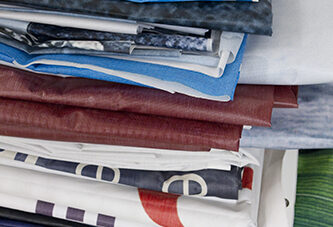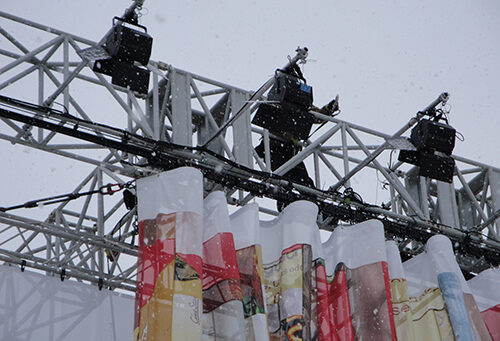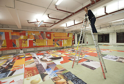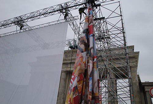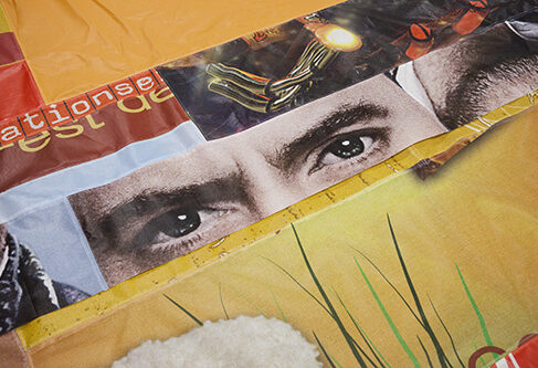 Ende 2009 wurde eine interessante Idee an uns herangetragen. Für die Berlinale 2010 – just in jenem Jahr feierte das Berliner Filmfest seinen Sechzigsten und das sollte gebührend gewürdigt werden – hatte sich die amerikanische Künstlerin Christina Kim etwas ganz Besonderes einfallen lassen: The Curtain – der Vorhang. Er sollte aus rund 2400 verschieden großen Einzelteilen, die alten Filmplakaten entnommen wurden, gefertigt werden. Die Größen der Einzelteile lagen teilweise im Meterbereich, einige Stücke waren auch nur wenige Zentimeter groß. Am Ende standen zwei jeweils 10 x 12 Meter große Vorhangteile, die sich ergänzten und ein komplettes Motiv ergaben. Das Projekt sollte mit und bei uns umgesetzt werden. Knapp anderthalb Monate wurde gemessen, geschnitten, genäht und dann war »The Curtain« fertig.